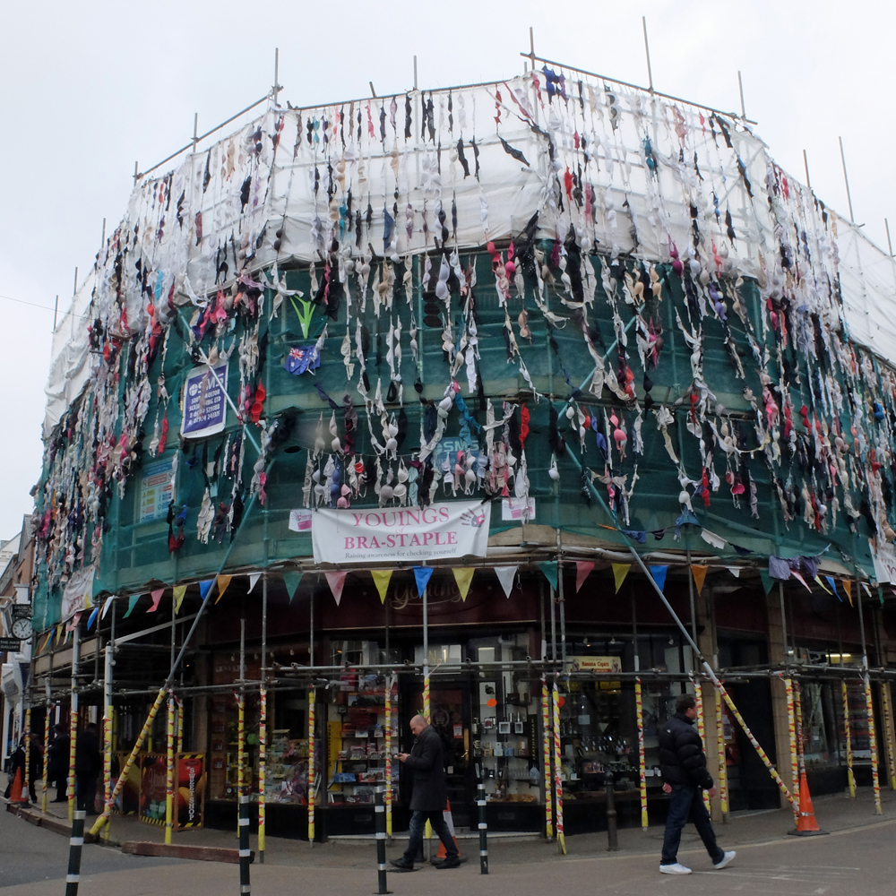 A shop in Barnstaple, in Devon, has been covered in donated bras in support of a breast cancer charity, CoppaFeel.org.