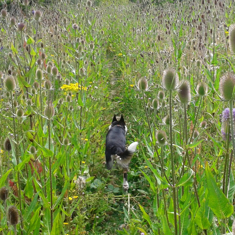 Lucy among teazles in Portbury Wharf Nature Reserve.