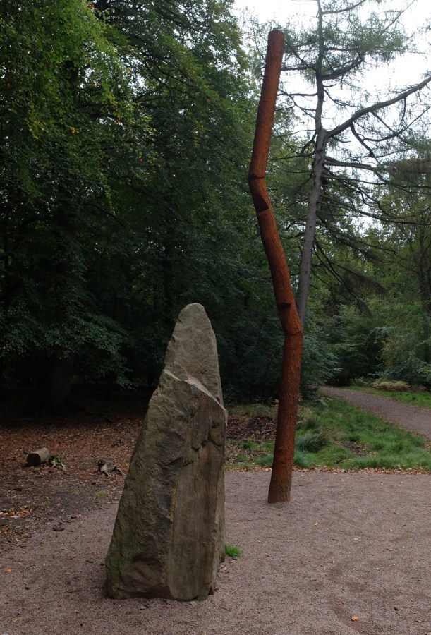 COAL MEASURE GIANTS by Henry Castle 2016. 300 million year old tree fossils sit alongside two cast iron sculptures sited 300 metres apart – the distance of the nearest coal seam below ground.