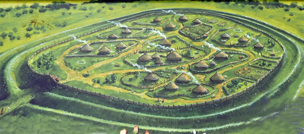 This Iron Age fort is only a few miles from us, but it seems a while since we were last there. We walked from the legendary Black Horse pub in Clapton in Gordano (currently closed, of course) under the M5, up a muddy track and then along the wooded ridge which is now Cadbury Camp Lane, known around here as Paranoia Parade due to the number of very expensive, gated, properties with notices describing the unattractively fierce nature of their guard dogs, which are “running free”. Well, only as free as their terrified owners, it would seem, confined within their high walls and panic rooms. Further on (nearer the fort) some sheep were being moved to lower pastures.
