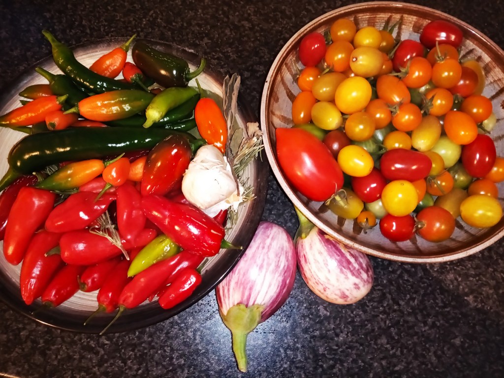 …and the last few tomatoes. And a couple of aubergines. The greenhouse has done well this year.