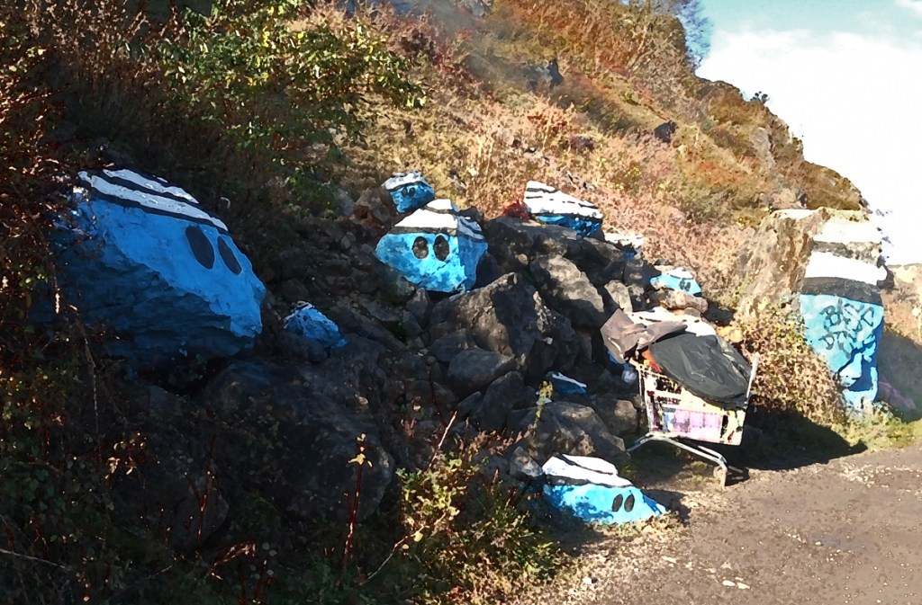 Some weirdly-painted rocks by the cycle track on the south side of the Avon Gorge. You must be the judge of whether or not the shopping trolley is an integral part of the installation.