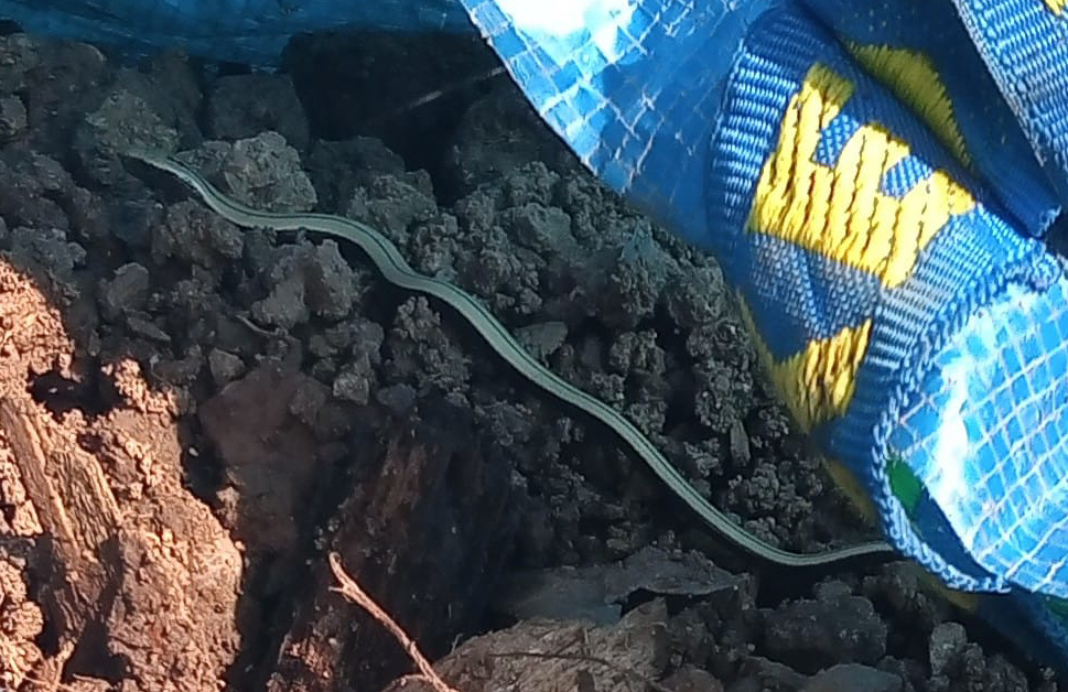 After rebuilding the last of our garden terraces (replacing the original, now rotting, wooden posts) we left some rubble in an old Ikea bag (top right) which was quickly snapped up by a family of slow worms. It’s like a jungle out there!